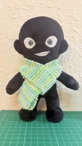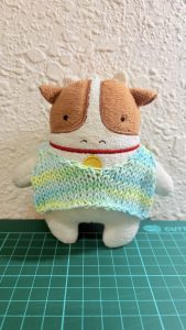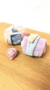 • 左一跟左二是應家人要求,使用大創線材製作的娃娃用圍巾跟毛衣,棒針製作,線材材質是棉50%+聚酯纖維50%。