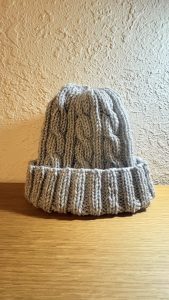 • 左二則是第一次挑戰看織圖製作的毛帽,加了新針法,使用棒針 / 輪針製作,線材使用icolor買的毛線,材質是壓克力纖維。