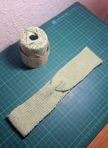 - 左一是髮帶,使用棒針製作,線材使用大創購買的100%棉線,目前成品送給親戚使用。